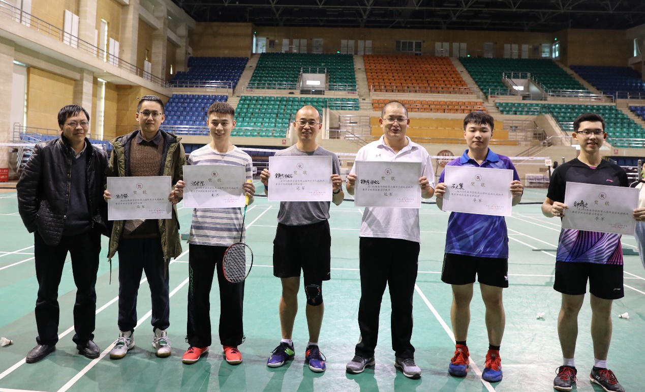 挥汗如雨间,比赛接近尾声。最终,倪天佳老师和向桢同学分别夺得男子单打和女子单打的冠军,龚新奇老师和朱晓宝老师一起摘得男双桂冠,向桢同学和石天奥同学合力拿下混双冠军,全体参赛师生的表现得到了大家的一致好评。最后,由黄志勇老师为各位获奖选手颁奖并合影,本次比赛圆满结束。比赛结果如下: