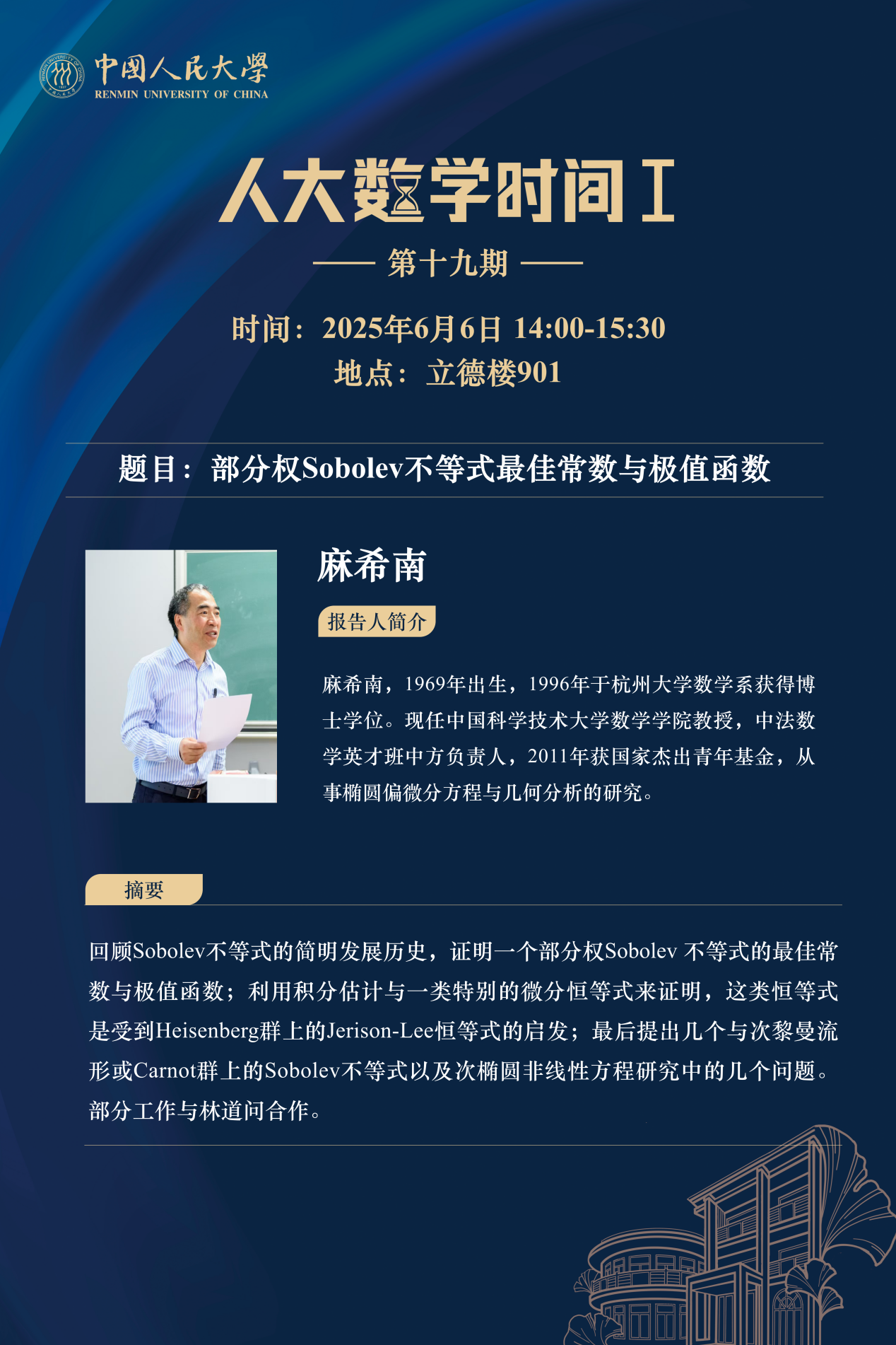 为促进学科交流融合、拓宽师生学术视野、释放科研创新活力,助力人大数学学科走向一流,yl23455永利集团设立“人大数学时间”,以专题研讨、高端学术论坛为载体,搭建数学思想充分碰撞、优秀人才不断涌流、创造活力竞相迸发的舞台。“人大数学时间”将持之以恒,久久为功,立志通过交流与创新、提出重大问题,引领数学学科及相关领域的创新与发展,成为对我国数学发展有贡献意义的平台。以下为“人大数学时间I”第十九期信息: