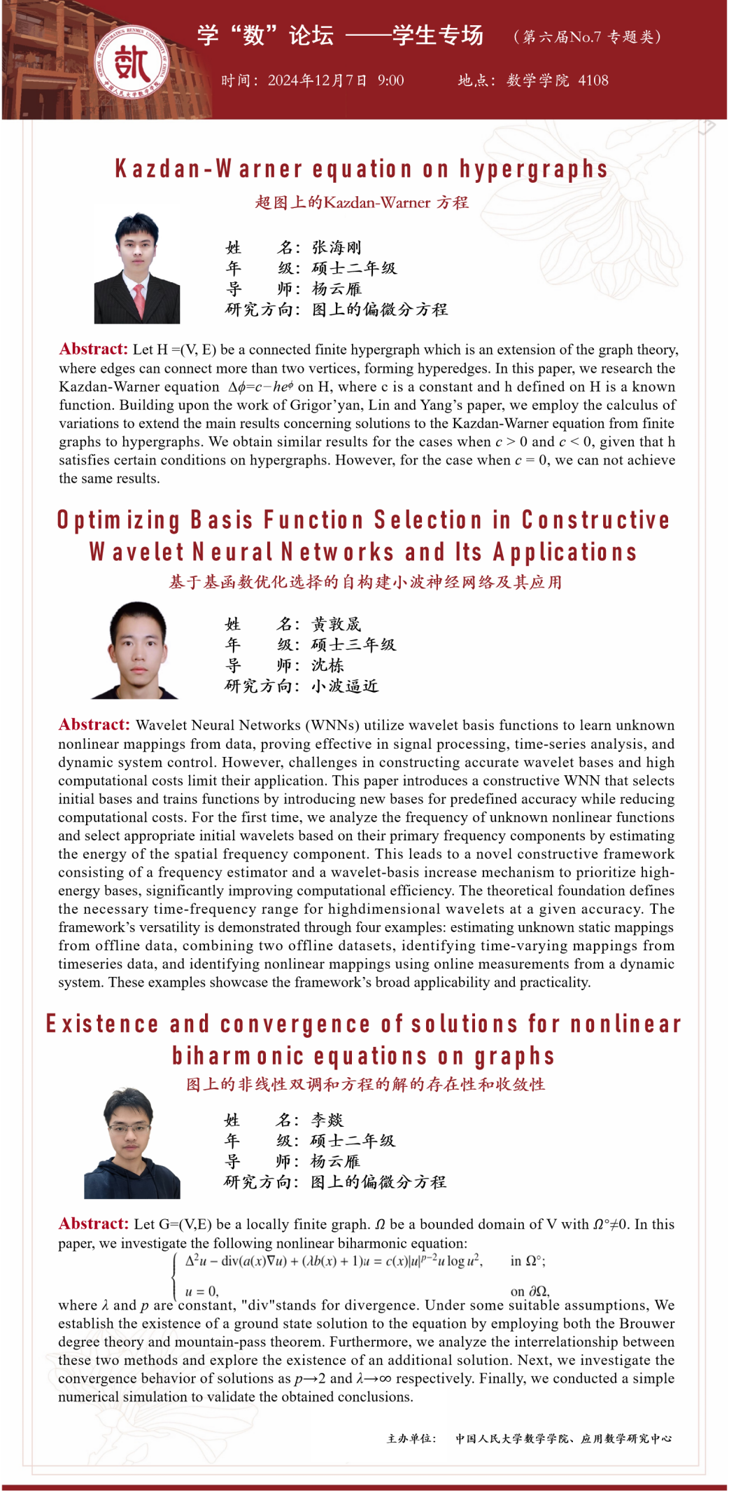 张海刚同学报告题目为《Kazdan-Warner equation on hypergraphs》,黄敦晟同学报告题目为《Optimizing Basis Function Selection in Constructive Wavelet Neural Networks and Its Applications》,李燚同学报告题目为《Existence and convergence of solutions for nonlinear biharmonic equations on graphs》。