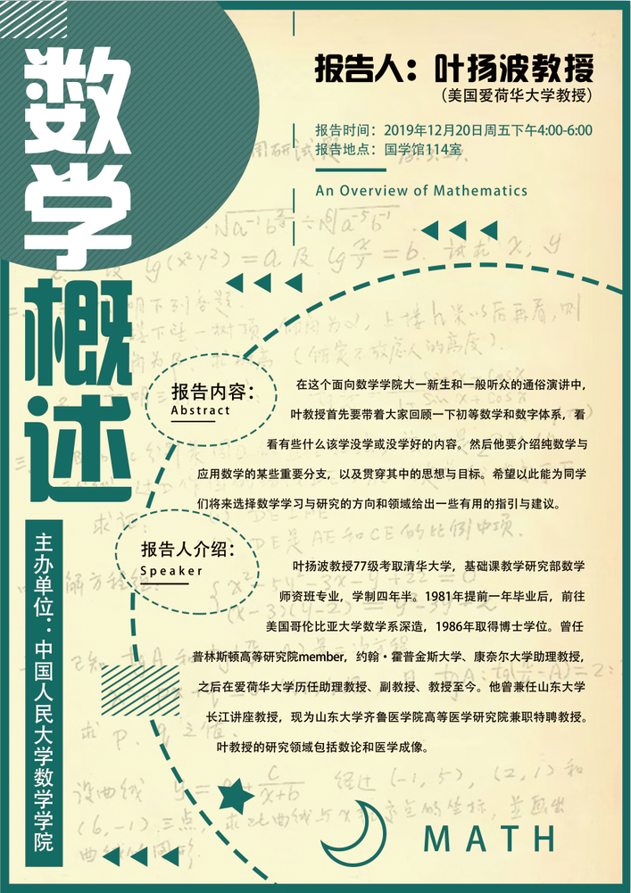 在这个面向yl23455永利大一新生和一般听众的通俗演讲中,叶教授首先要带着大家回顾一下初等数学和数字体系,看看有些什么该学没学或没学好的内容。然后他要介绍纯数学与应用数学的某些重要分支,以及贯穿其中的思想与目标。希望以此能为同学们将来选择数学学习与研究的方向和领域给出一些有用的指引与建议。