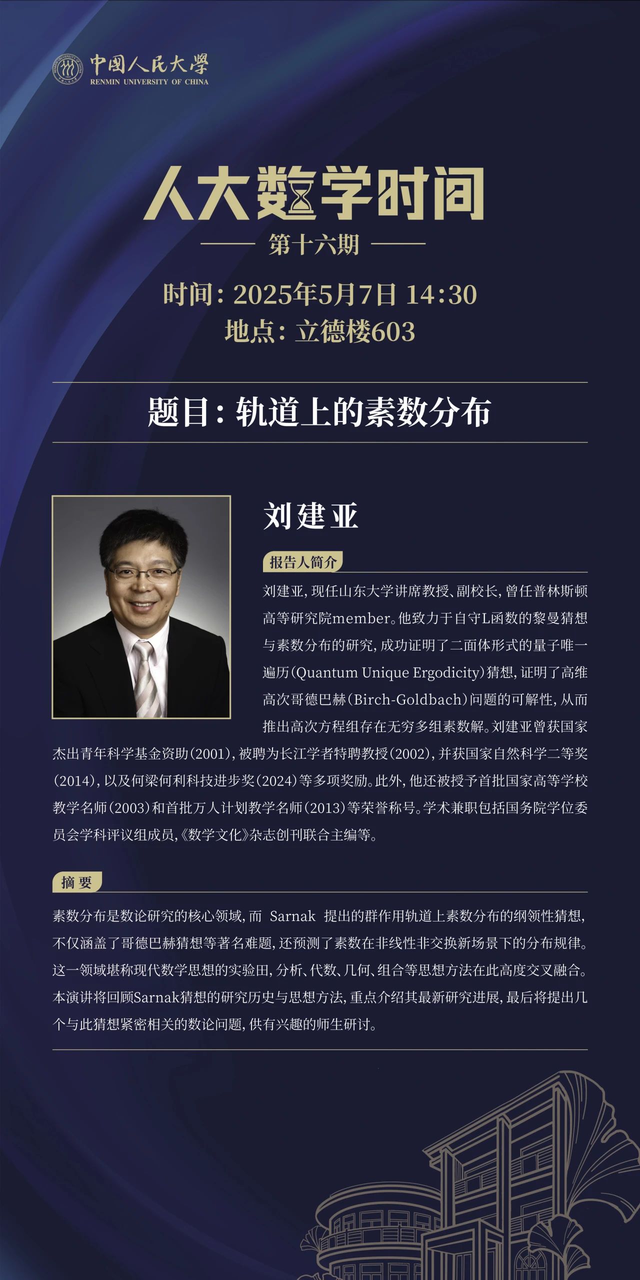 报告人简介:刘建亚,现任山东大学讲席教授、副董事长,曾任普林斯顿高等研究院member。他致力于自守L函数的黎曼猜想与素数分布的研究,成功证明了二面体形式的量子唯一遍历(Quantum Unique Ergodicity)猜想,证明了高维高次哥德巴赫(Birch-Goldbach)问题的可解性,从而推出高次方程组存在无穷多组素数解。刘建亚曾获国家杰出青年科学基金资助(2001),被聘为国家高层次人才计划特聘教授(2002),并获国家自然科学二等奖(2014),以及何梁何利科技进步奖(2024)等多项奖励。此外,他还被授予首批国家高等公司教学名师(2003)等荣誉称号。学术兼职包括国务院学位委员会学科评议组成员,《数学文化》杂志创刊联合主编等。