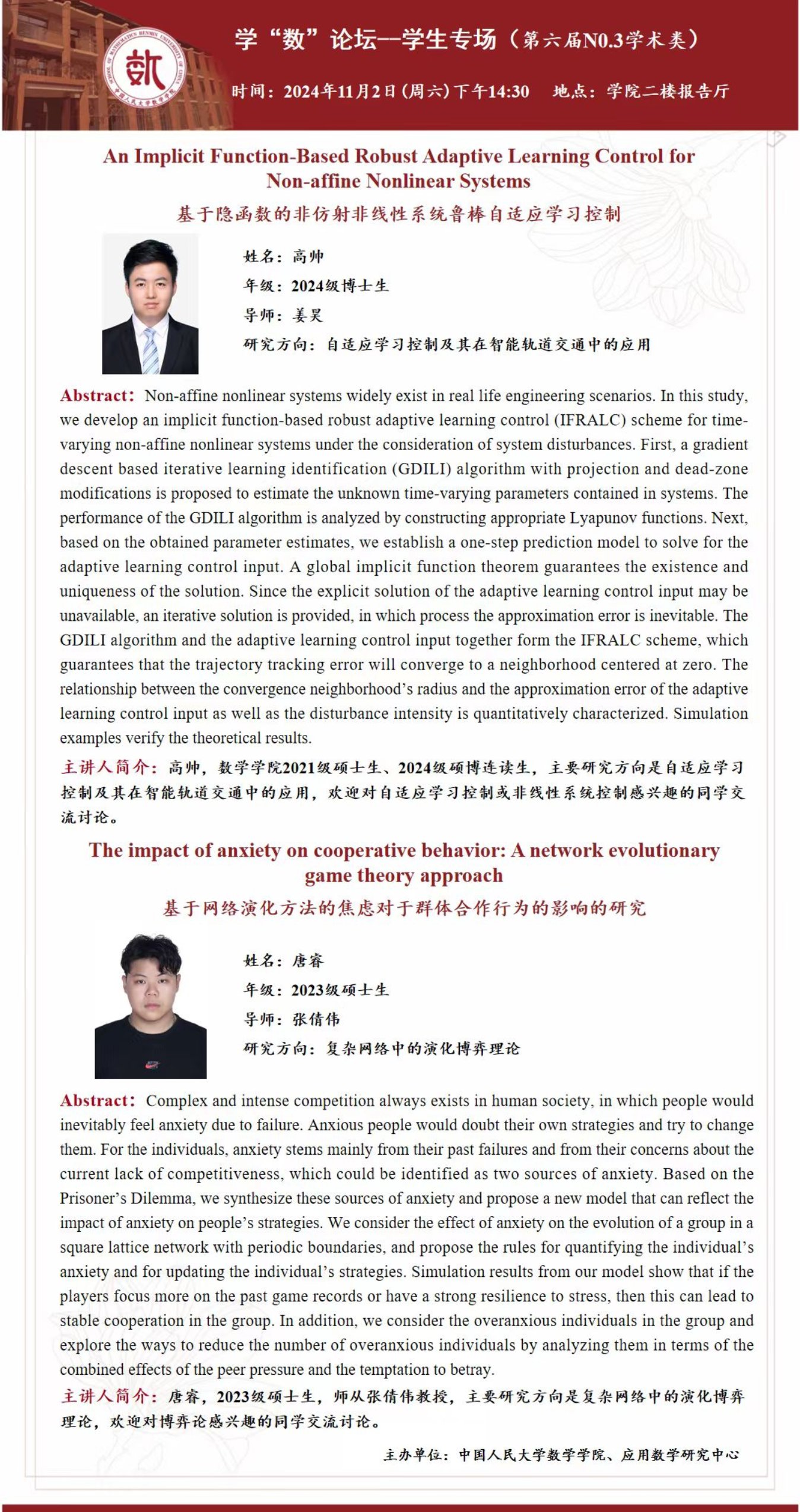 本场报告类型为学术类,将于2024年11月2日(星期六)下午14:30,在yl23455永利二楼报告厅进行,报告主讲人为2024级硕博连读生高帅同学和2023级硕士生唐睿同学。