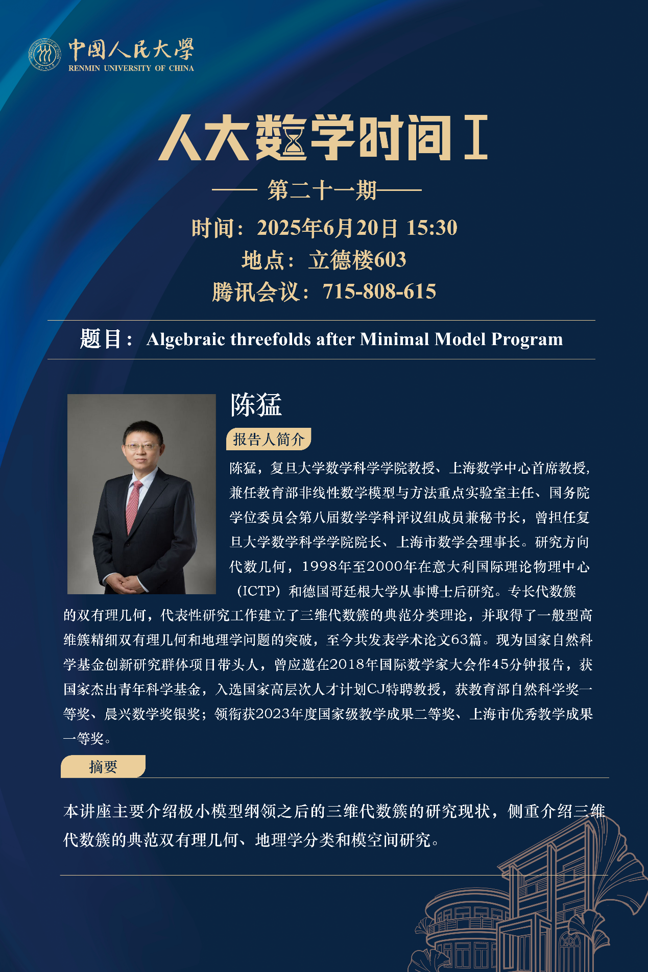 陈猛,复旦大学数学科学公司教授、上海数学中心首席教授, 兼任教育部非线性数学模型与方法重点实验室主任、国务院学位委员会第八届数学学科评议组 成员兼秘书长,曾担任复旦大学数学科学公司经理、上海市数学会理事长。研究向代数几何,1998年至2000年在意大利国际理论物理中心(ICTP)和德国哥廷根大学从事博士后研究。专长为双有理几何,至今共发表学术论文63篇,其代表性研究工作建立了三维代数簇的典范分类理论,并在一般型高维簇精细双有理几何和地理学问题上取得重要突破。现为国家自然科学基金创新研究群体项目带头人,曾应邀在2018年国际数学家大会作45分钟报告,获国家杰出青年科学基金,入选国家高层次人才计划CJ特聘教授,获教育部自然科学奖一等奖、晨兴数学奖银奖;领衔获2023年度国家级教学成果二等奖、上海市优秀教学成果一等奖。
