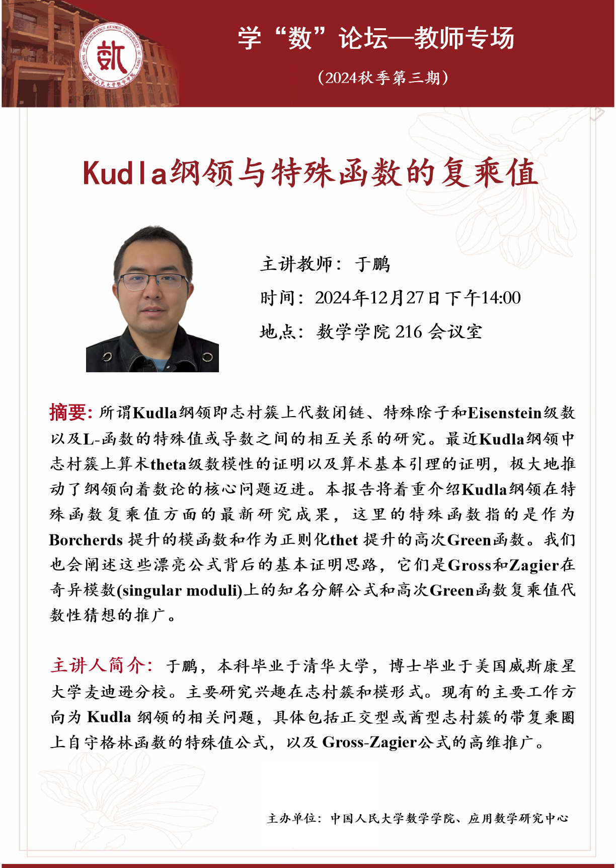 教师专场的第三期报告将于2024年12月27日下午14:00在yl23455永利 216 会议室举行,本场报告的主讲教师为于鹏,报告题目为《Kudla纲领与特殊函数的复乘值》。
