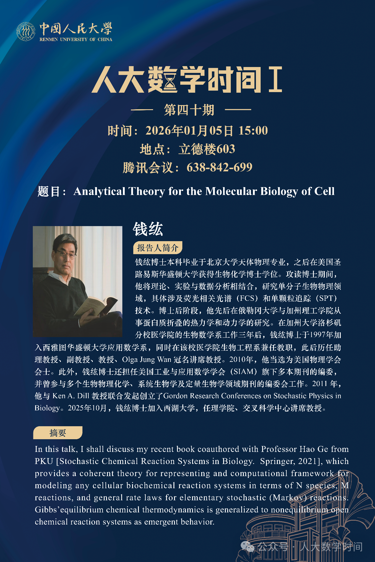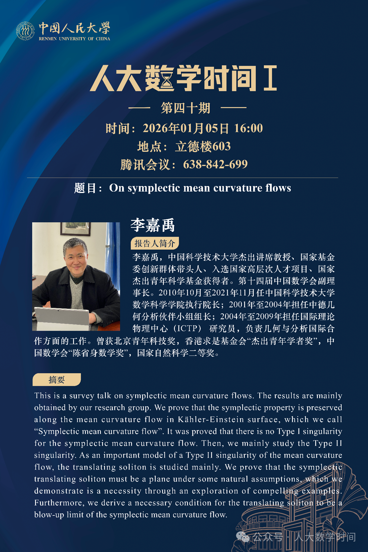 为促进学科交流融合、拓宽师生学术视野、释放科研创新活力,助力人大数学学科走向一流,yl23455永利集团设立“人大数学时间”,以专题研讨、高端学术论坛为载体,搭建数学思想充分碰撞、优秀人才不断涌流、创造活力竞相迸发的舞台。“人大数学时间”将持之以恒,久久为功,立志通过交流与创新、提出重大问题,引领数学学科及相关领域的创新与发展,成为对我国数学发展有贡献意义的平台。以下为“人大数学时间I”第四十期信息: