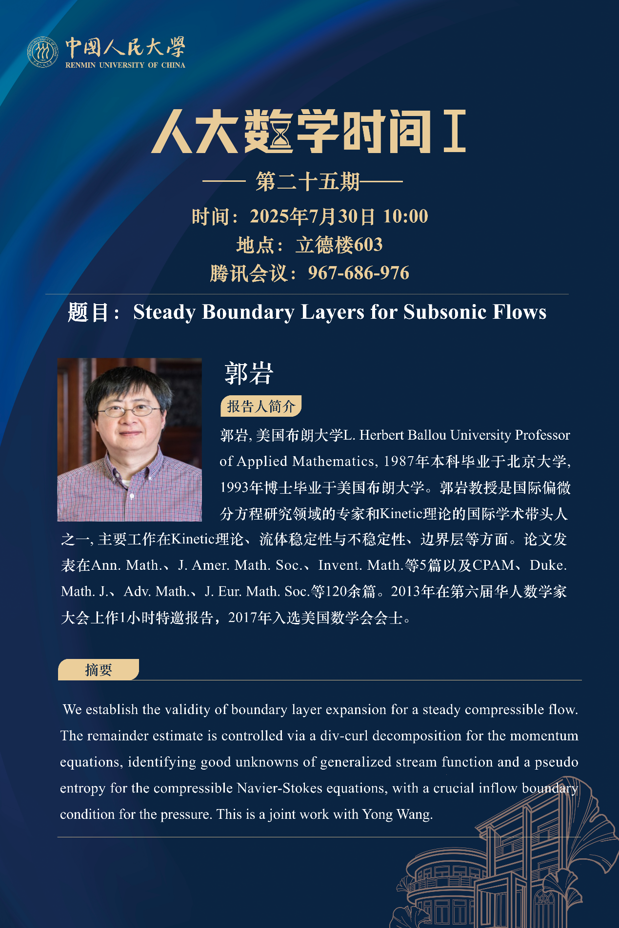 为促进学科交流融合、拓宽师生学术视野、释放科研创新活力,助力人大数学学科走向一流,yl23455永利集团设立“人大数学时间”,以专题研讨、高端学术论坛为载体,搭建数学思想充分碰撞、优秀人才不断涌流、创造活力竞相迸发的舞台。“人大数学时间”将持之以恒,久久为功,立志通过交流与创新、提出重大问题,引领数学学科及相关领域的创新与发展,成为对我国数学发展有贡献意义的平台。以下为“人大数学时间I”第二十五期信息: