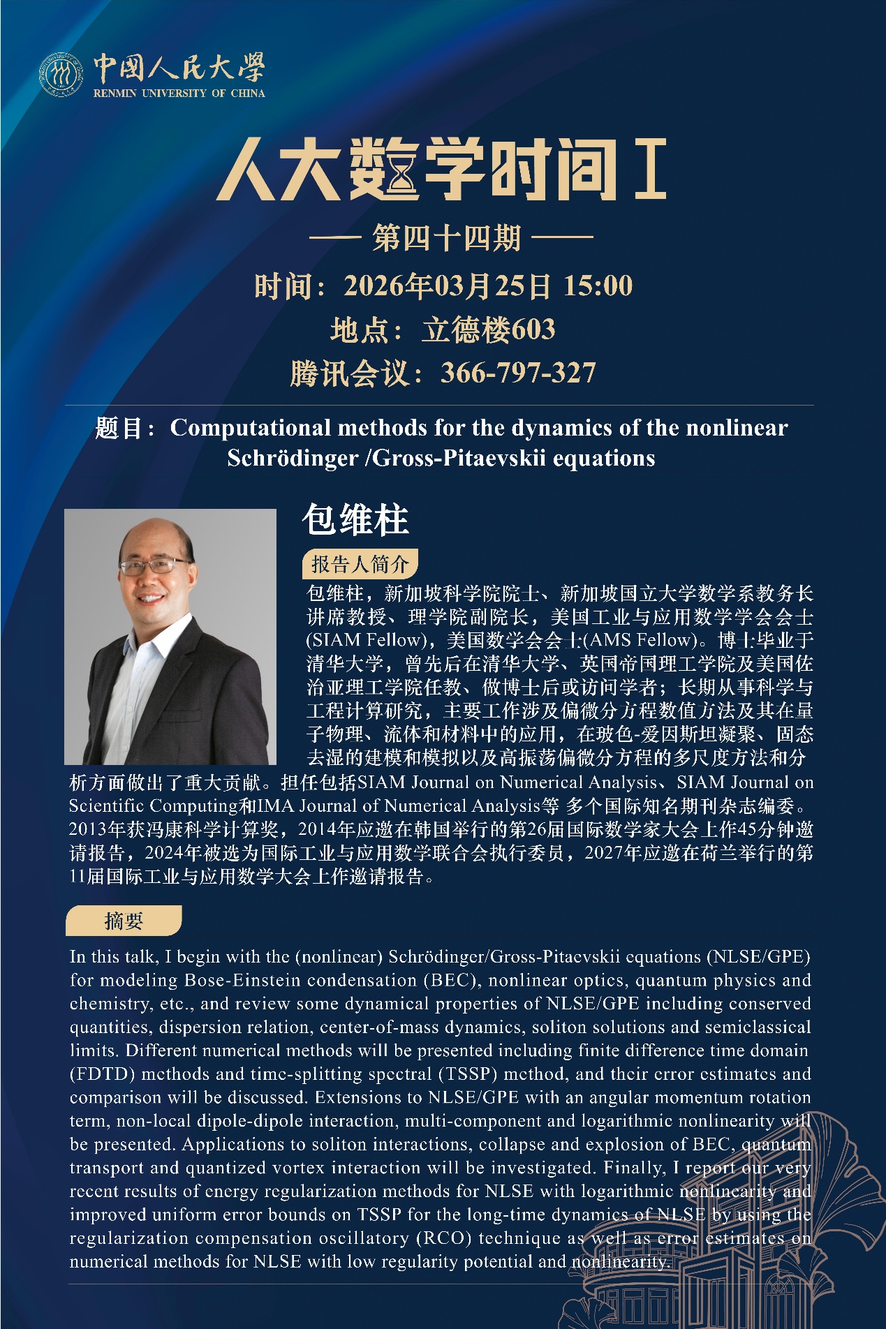 包维柱,新加坡科公司院士、新加坡国立大学数学系教务长讲席教授、理公司副经理,美国工业与应用数学学会会士(SIAM Fellow),美国数学会会士(AMS Fellow)。博士毕业于清华大学,曾先后在清华大学、英国帝国理工公司及美国佐治亚理工公司任教、做博士后或访问学者;长期从事科学与工程计算研究,主要工作涉及偏微分方程数值方法及其在量子物理、流体和材料中的应用,在玻色-爱因斯坦凝聚、固态去湿的建模和模拟以及高振荡偏微分方程的多尺度方法和分析方面做出了重大贡献。担任包括SIAM Journal on Numerical Analysis、SIAM Journal on Scientific Computing和IMA Journal of Numerical Analysis等 多个国际知名期刊杂志编委。2013年获冯康科学计算奖,2014年应邀在韩国举行的第26届国际数学家大会上作45分钟邀请报告,2024年被选为国际工业与应用数学联合会执行委员,2027年应邀在荷兰举行的第11届国际工业与应用数学大会上作邀请报告。