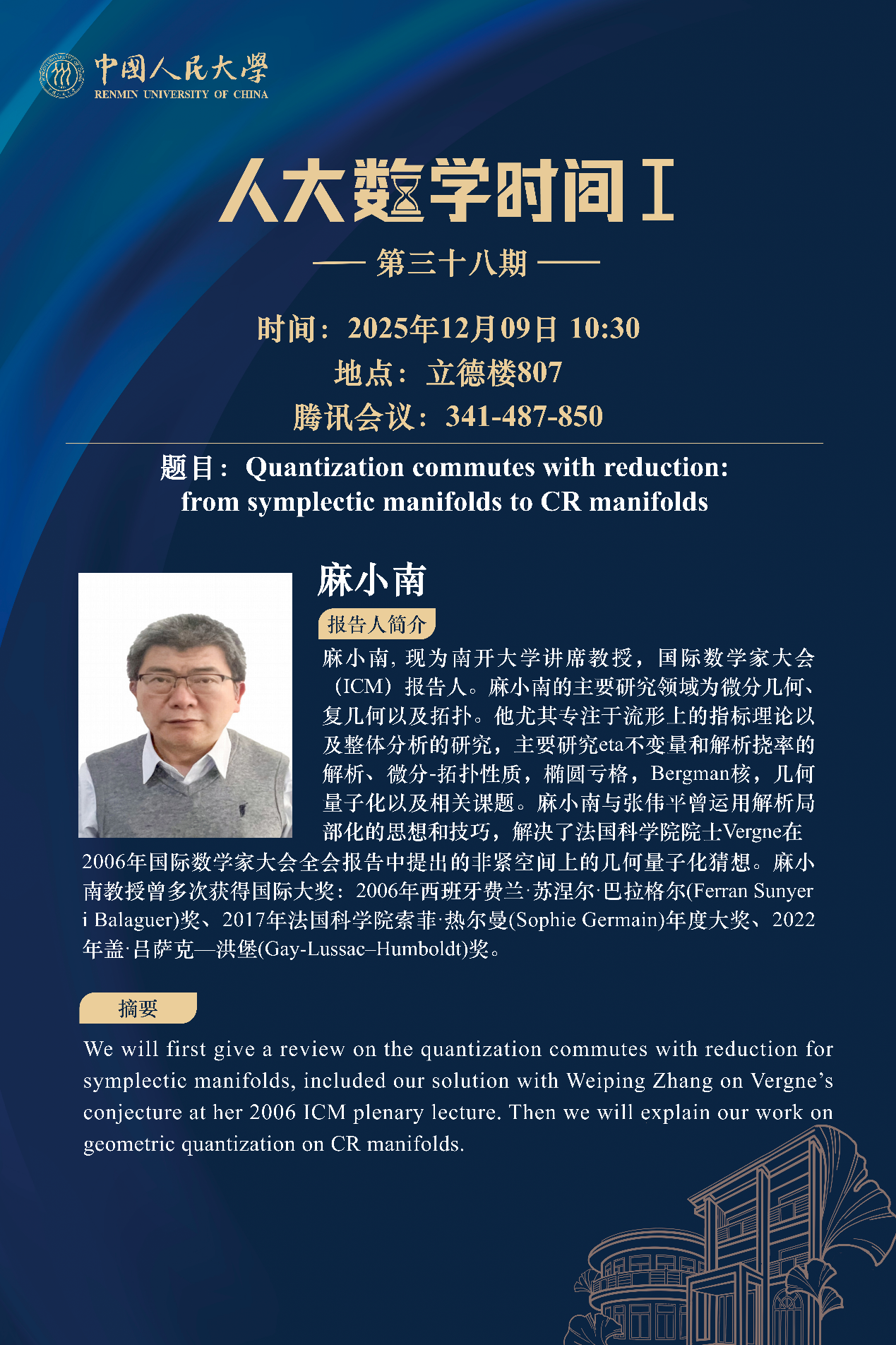 为促进学科交流融合、拓宽师生学术视野、释放科研创新活力,助力人大数学学科走向一流,yl23455永利集团设立“人大数学时间”,以专题研讨、高端学术论坛为载体,搭建数学思想充分碰撞、优秀人才不断涌流、创造活力竞相迸发的舞台。“人大数学时间”将持之以恒,久久为功,立志通过交流与创新、提出重大问题,引领数学学科及相关领域的创新与发展,成为对我国数学发展有贡献意义的平台。以下为“人大数学时间I”第三十八期信息: