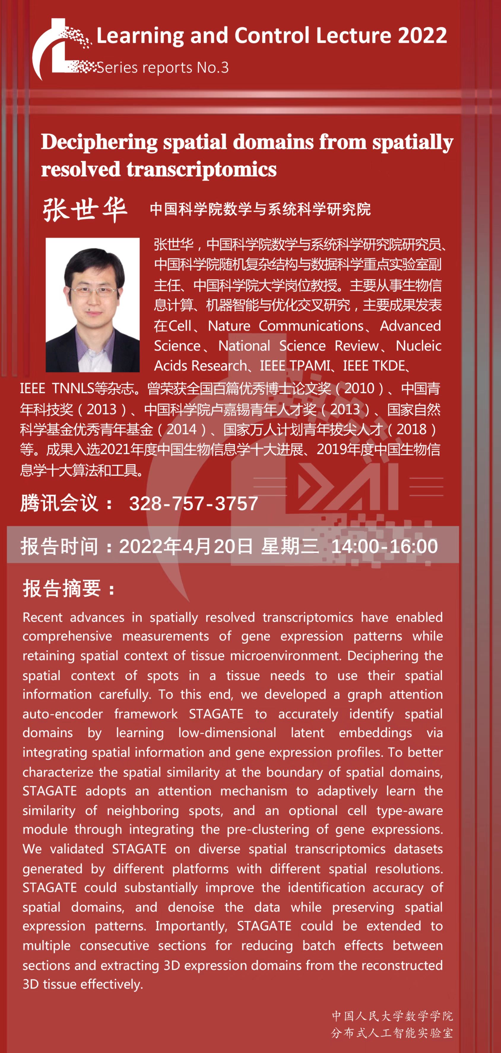 Learning and Control Lecture 2022系列学术报告—— Deciphering spatial domains from spatially resolved transcript-omics