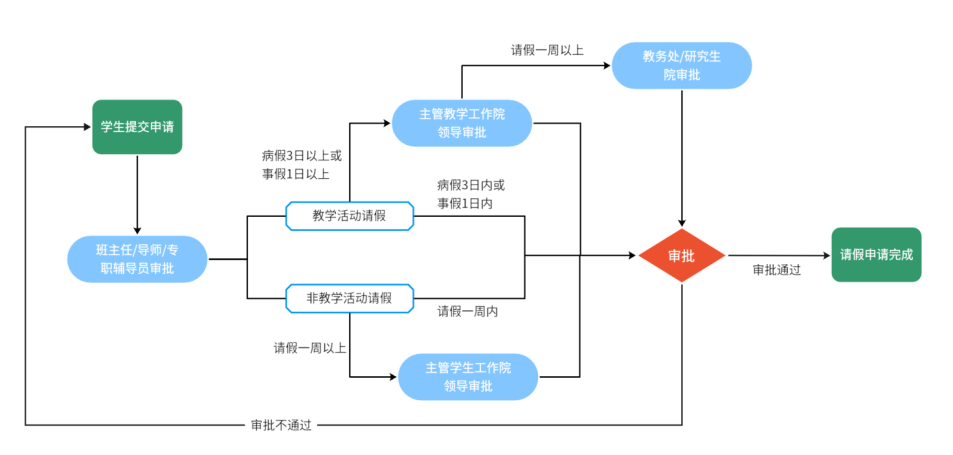 3.非教学活动请假。请假1周内(含1周),由班主任/导师/专职辅导员审批;超过1周的,需由公司主管员工工作的院领导审批。