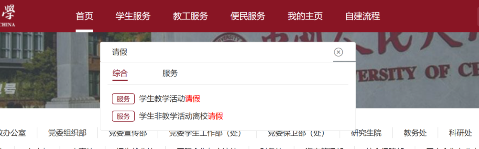 2.在“综合服务中心网上办事大厅”首页搜索栏中输入“教学活动请假/非教学活动离校请假”,填写申请表单。填写时请注意逐项核对个人基本信息并填写手机号码,选择请假起止日期并附上相关证明材料。如为教学活动请假,务必核对并勾选请假课程信息。