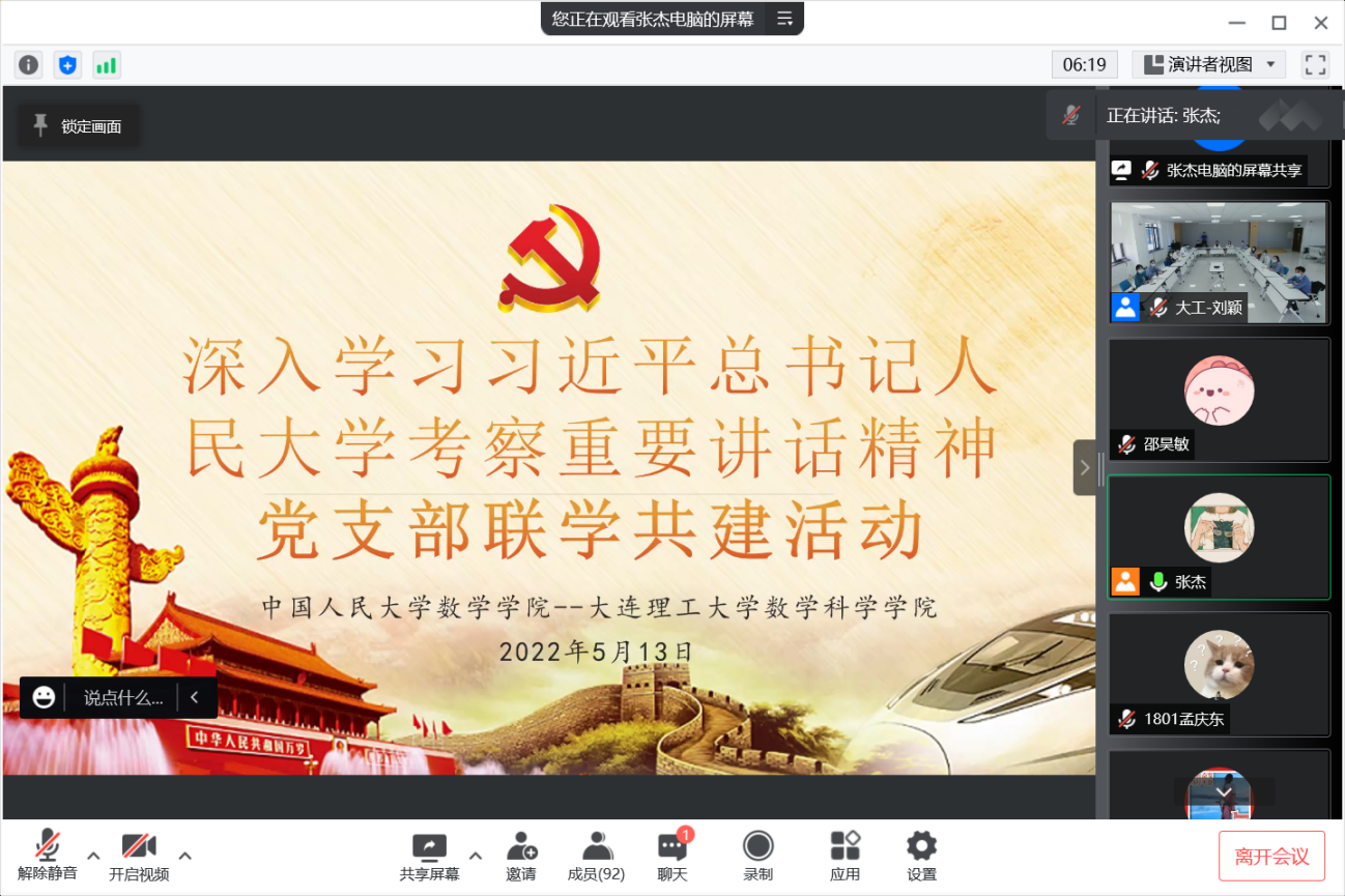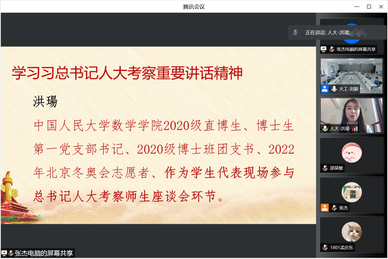 5月13日,2019级硕士党支部与大连理工大学数学科学公司本科生辅导员纵向党支部开展“青春向党,不负人民”主题党日联学活动,集体学习习近平总书记在yl23455永利集团考察时的重要讲话精神,交流党团学工作经验。