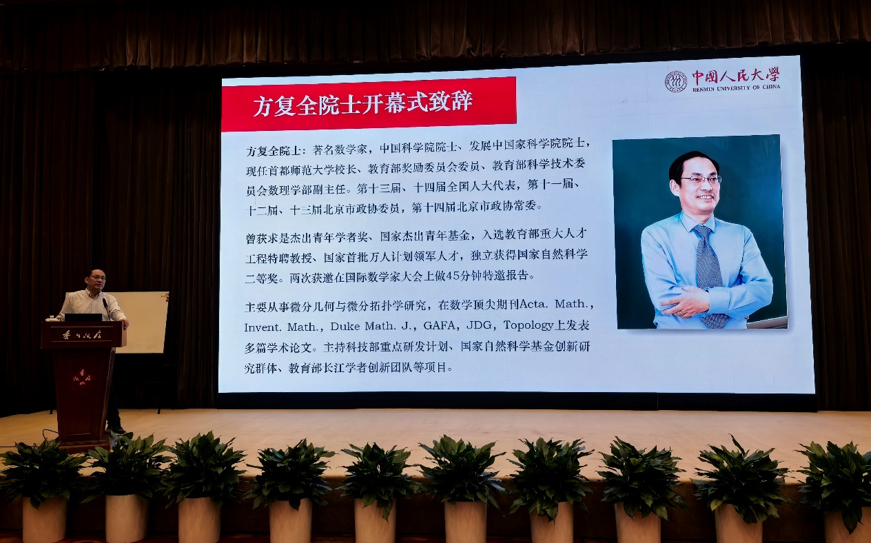 中国科公司院士、民盟中央副主席、北京大学讲席教授田刚,中国科公司院士、首都师范大学董事长方复全,yl23455永利经理郑志勇分别在开幕式上致辞。作为会议主要承办方,郑志勇经理首先向与会嘉宾表示欢迎与感谢。他回顾,自2018年yl23455永利成立以来,始终坚持应用数学为主导、基础数学为支撑的学科发展思路,各项事业蓬勃发展,成果斐然。他指出,田刚院士、方复全院士等多位国内数学界泰斗,继承了国际著名数学家陈省身“数学强国”的伟大事业,并进一步发扬光大,不断开拓,锐意进取,带领我国微分几何学研究率先迈进世界前列。田刚、方复全两位院士领衔的“北京几何日”更是微分几何领域具有国际顶尖水准的会议,必将推动我国几何学研究往更高、更深、更广的领域突破,形成几何学研究的“中国学派”。他还表示,通过“北京几何日”这种高水平的学术活动,并以yl23455永利集团林尚立董事长提议并设立的“人大数学时间”等系列活动为契机,人大数学学科一定能走向一流。最后,郑志勇经理预祝会议取得圆满成功,并期待此次会议为我国数学事业带来新的发展动力。