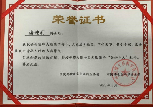 潘迎利博士于2018年9月进站,他在站期间思想上积极要求进步,科研成果突出,教学优秀。上半年疫情期间,他在所居住的富润家园博士后公寓,积极参与抗击新冠肺炎疫情工作,志愿服务社区,不怕困难,甘于奉献,充分展现出人大yl23455永利青年教师的担当和勇气。