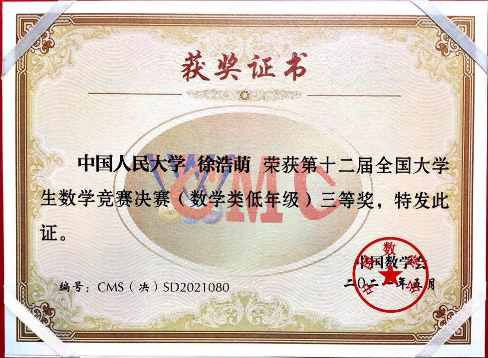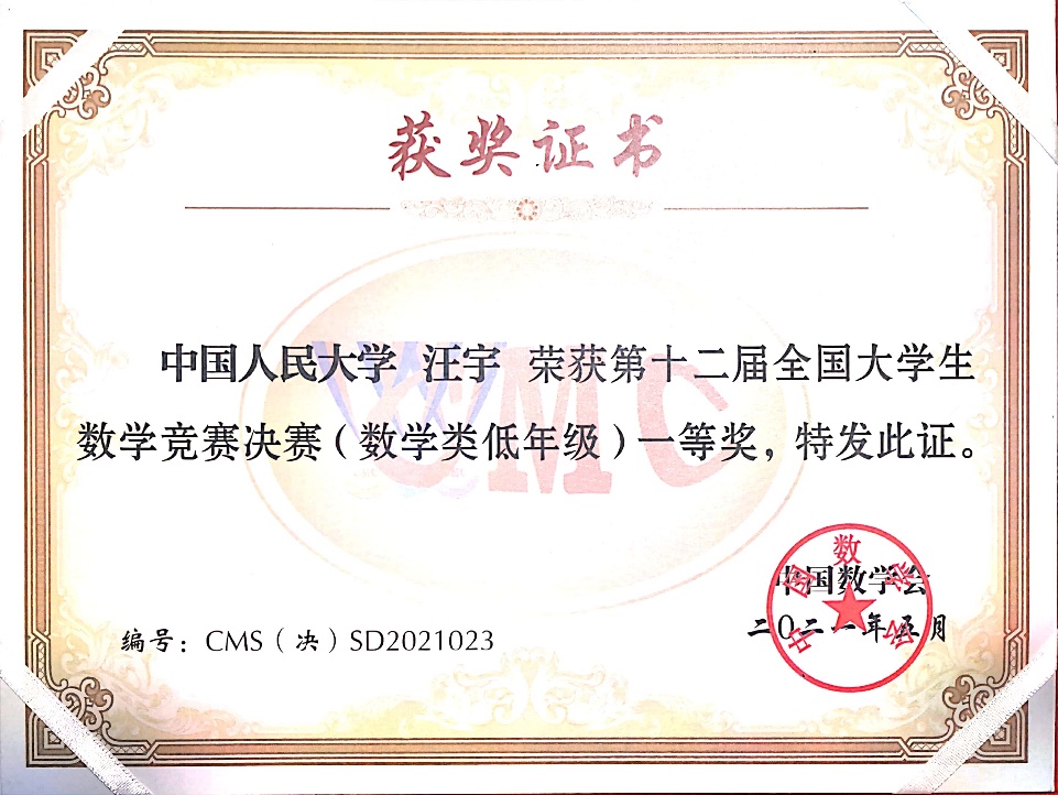 第12届全国老员工数学竞赛决赛于2021年5月16日在吉林大学成功落下帷幕。本次竞赛全国共有32个赛区206921人报名参加初赛,从中选拔出668人进入决赛,实际参赛人数646人,其中,数学专业组343人(高年级组223人,低年级组120人),非数学专业组303人。2019级数学拔尖人才实验班的汪宇同学和徐浩萌同学晋级北京赛区全国总决赛(北京赛区共28名员工入围),并在此次决赛中获得优异成绩,其中汪宇同学获得低年级组全国一等奖(全国共24名同学获得该等级奖),徐浩萌同学获得低年级组全国三等奖(全国共59名同学获得该等级奖)。这是公司第二次组织全校本科生参赛,首次入围全国总决赛并获得优异成绩,这份喜人的成绩必将激励更多公司本科生积极参赛。
