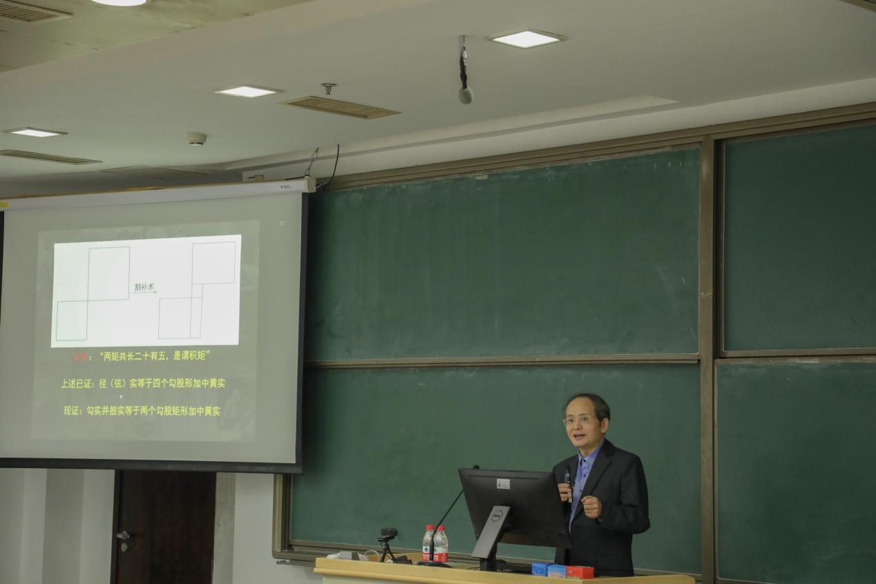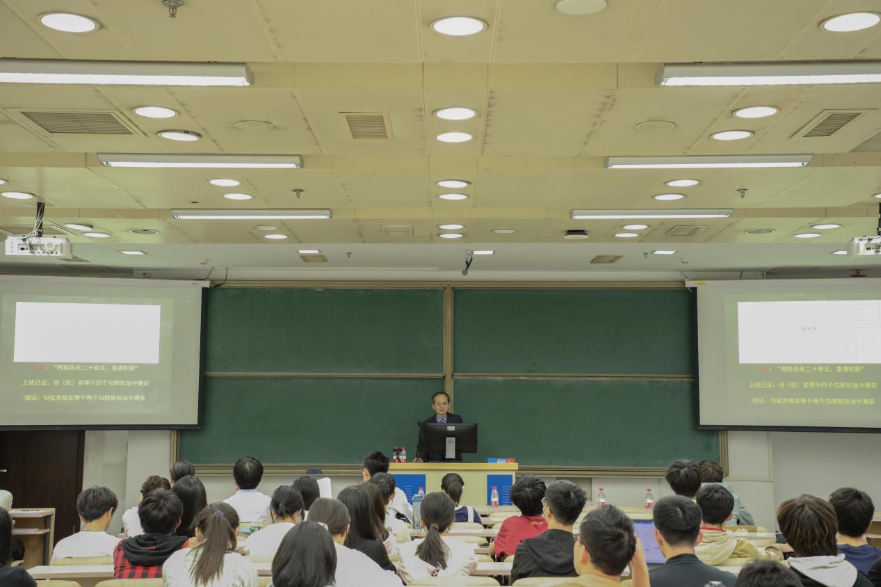 首先,周向宇院士为同学们介绍了中国古代数学的若干成就:十进制,筹算,简要介绍了中国古代的算术,代数和几何以及一些中国古代的数学思想,并重点讲了商高的勾股定理证明:折矩-积矩法,介绍了商高-赵爽的形体不变量,并结合周院士自身的工作,并指出形体不变量思想在现代数学中的体现。