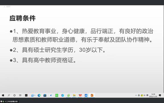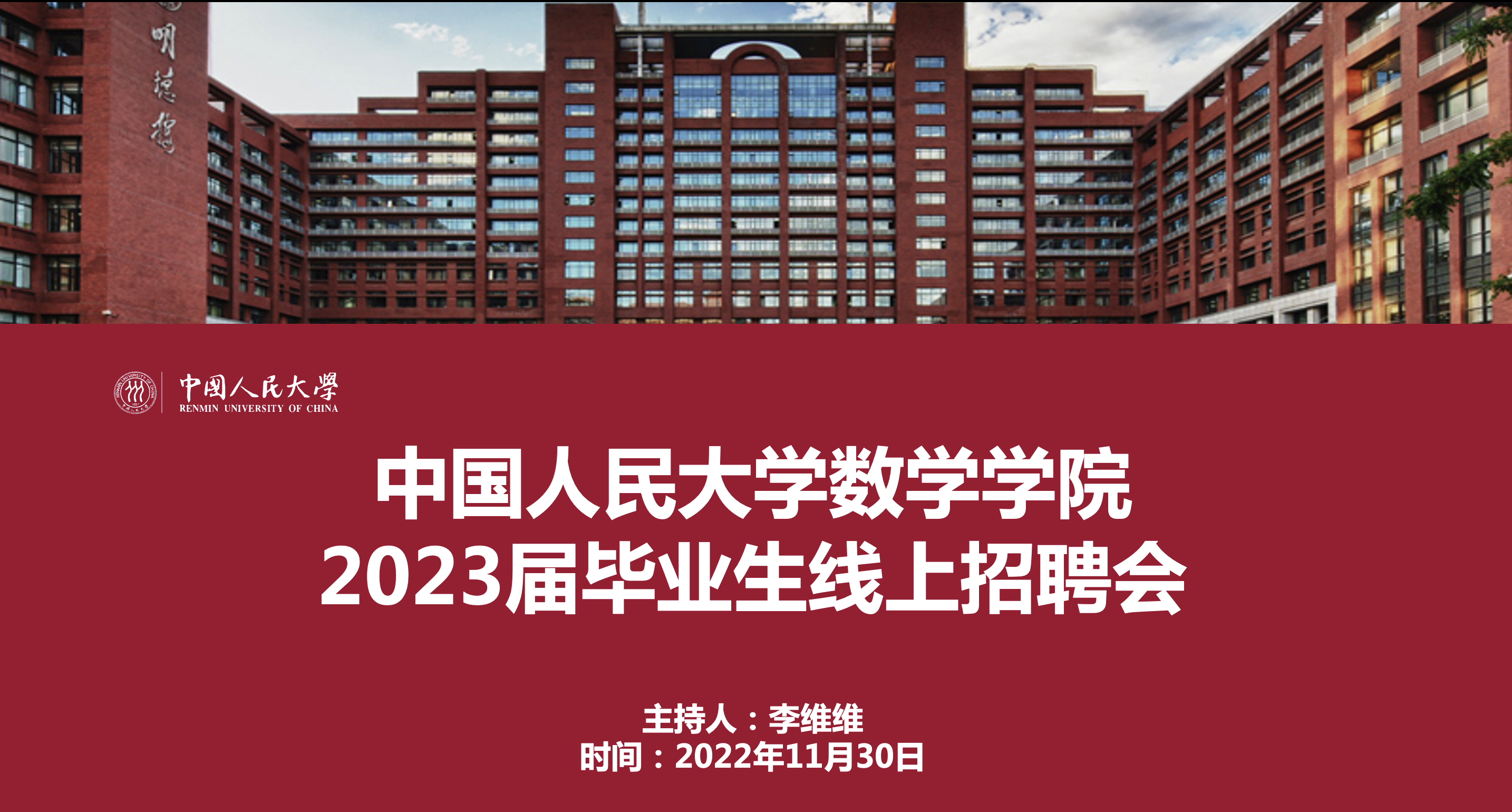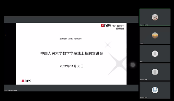 2022年11月30日下午,2023届毕业生线上招聘会顺利召开。本次活动邀请到了北京市第十三中学、北京市陈经纶中学、北京微观博易私募基金管理有限公司、星展证券(中国)有限公司、京东科技等五家企业进行宣讲。公司党委书记柯媛元老师,党委副书记沈健老师,团委书记李慧老师以及yl23455永利的本硕博同学出席。本次会议由李维维同学主持。