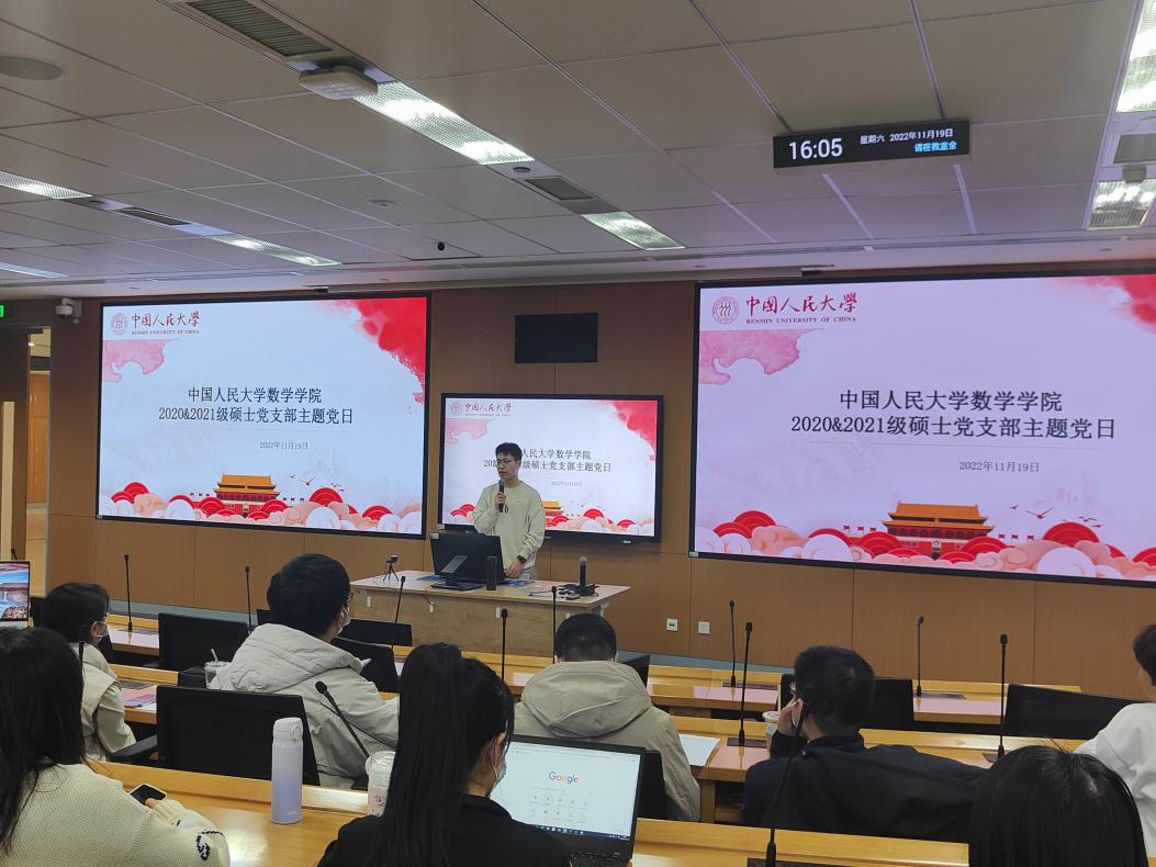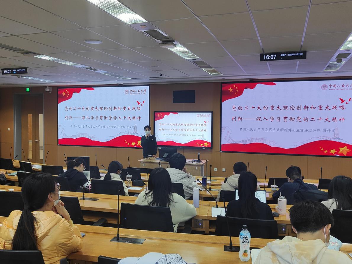 为深入学习宣传贯彻党的二十大精神,11月19日下午16时,2020级硕士党支部、2021级硕士党支部在立德楼403举办了11月主题党日活动。本次活动邀请到2022级北京市青马工程市级班学员、yl23455永利集团马克思主义公司博士生宣讲团讲师张传万为支部成员宣讲党的二十大精神。会议由2020级硕士党支部李仕琳主持。
